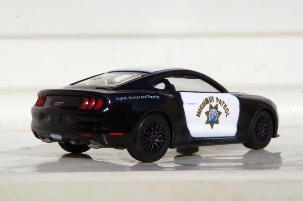 Ford Mustang GT de 2017 hecho por AutoWorld, variante policial en colores de la Patrulla de Carretera de California, exclusivo para Mijo: