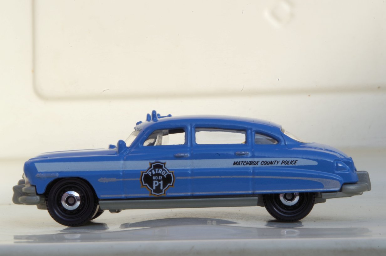 Patrullero Hudson Hornet sedán de 4 puertas de 1951 hecho por Matchbox, variante celeste de la Policía del Condado Matchbox del año 2019: