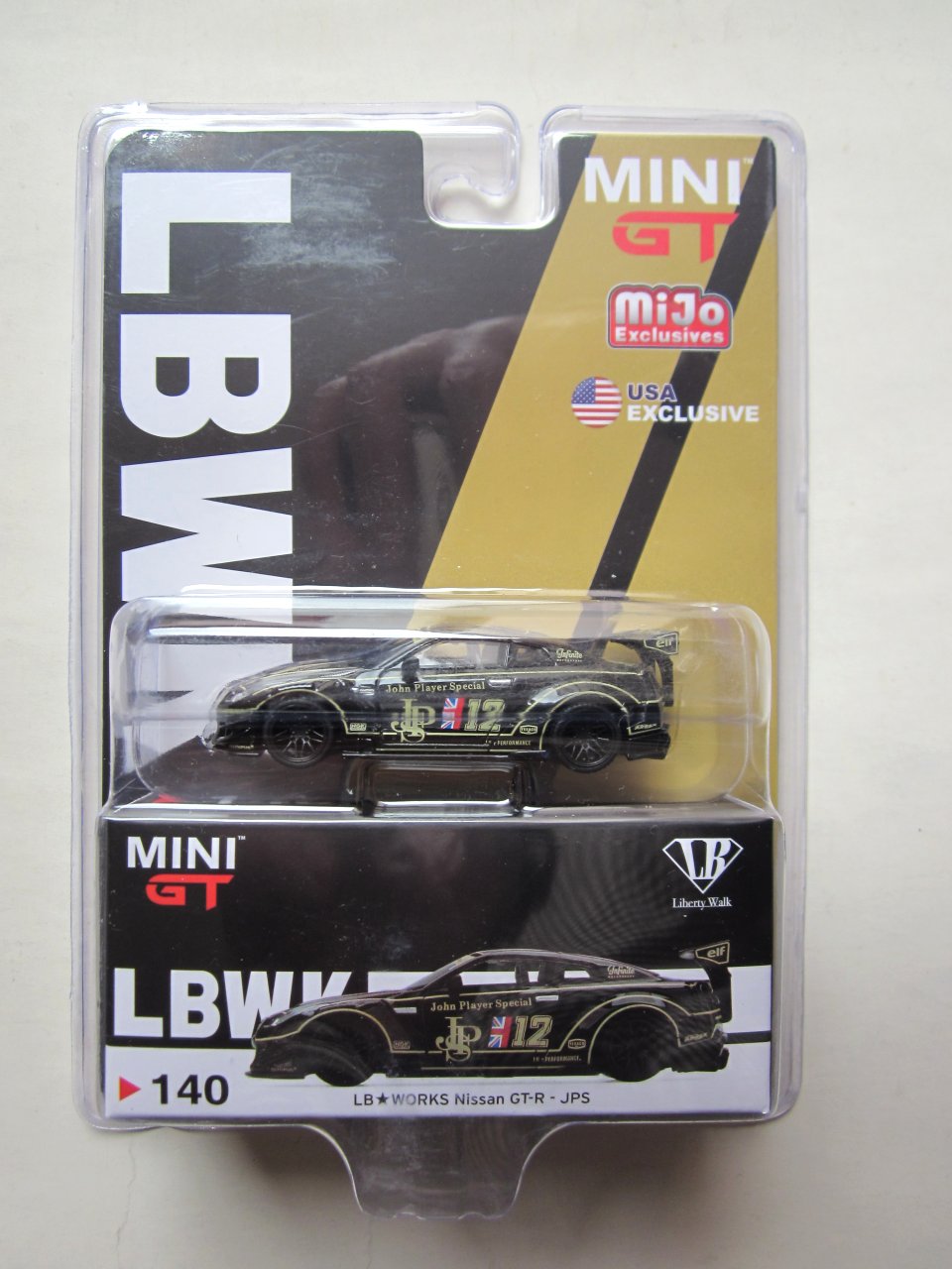 Nissan GT-R (R35) hecho por Mini GT, variante en los colores negro y dorado de John Player Special representando al auto personalizado por Liberty Walk (LB Works), exclusivo de MiJo: