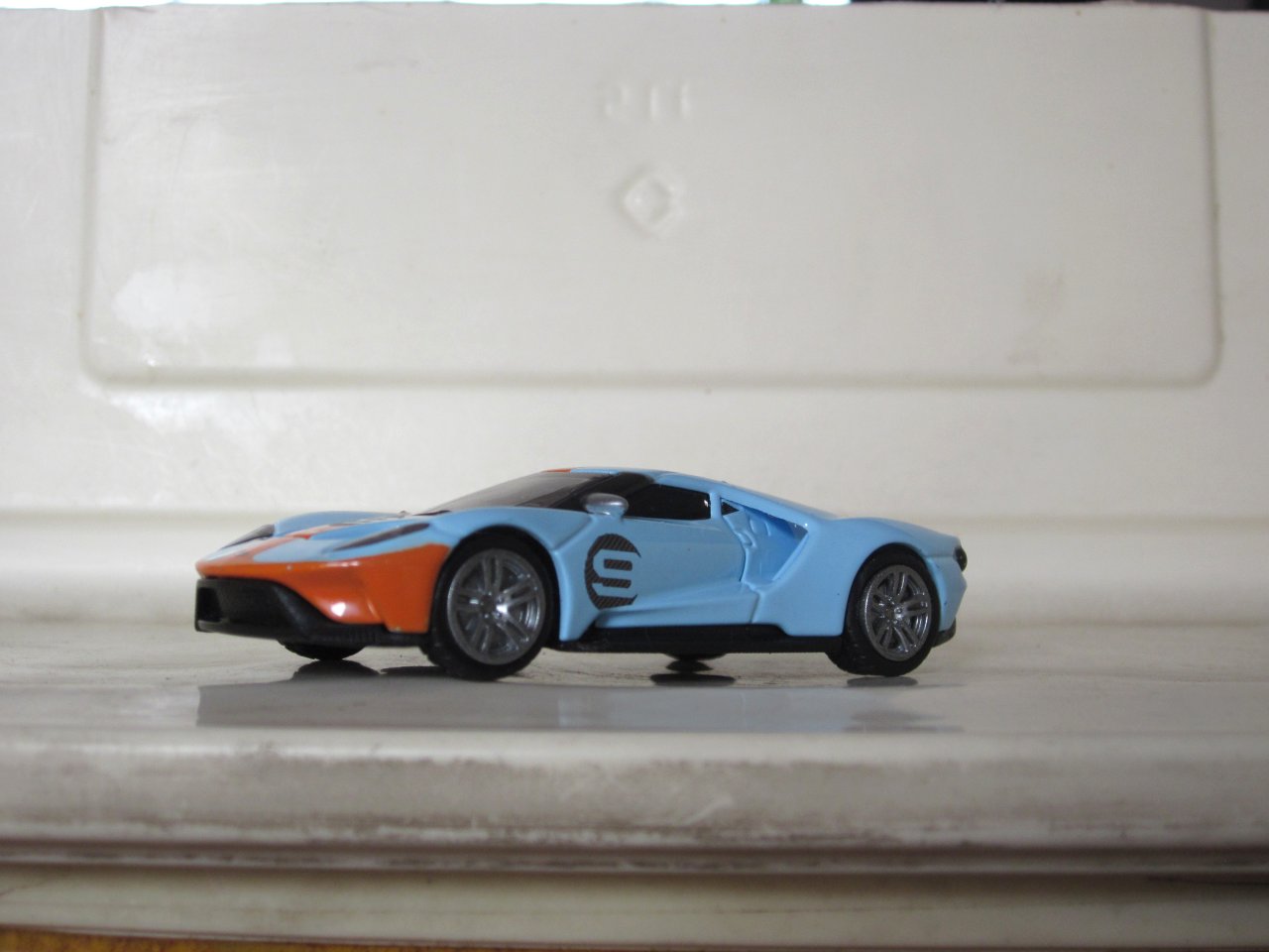 Aquí junto al Ford GT 2019 hecho por Greenlight, variante "Heritage Edition 2019" en los colores celeste y naranja de Gulf con el #9 en tributo al ganador de las 24 Horas de LeMans de 1968, exclusiva para tiendas de hobby: