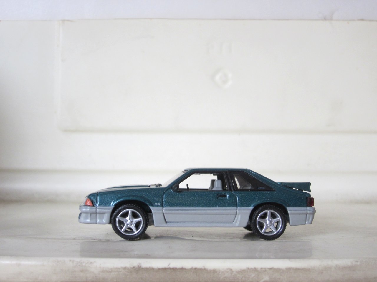 Ford Mustang GT de 1991 hecho por Greenlight, variante turquesa con gris de la serie 31 de Greenlight Hollywood, representando al de Brad Taylor (Zachery Ty Bryan), el hijo mayor de Tim "The Tool Man" Taylor, en la serie de TV "Mejorando la casa" ("Home Improvement"):