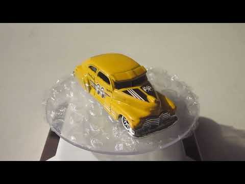 Chevy Fleetline de 1947 hecho por Hot Wheels, variante amarilla del año 2022 (primera edición con molde modificado respecto del original de 2004) con logos de MoonEyes y Goodyear: