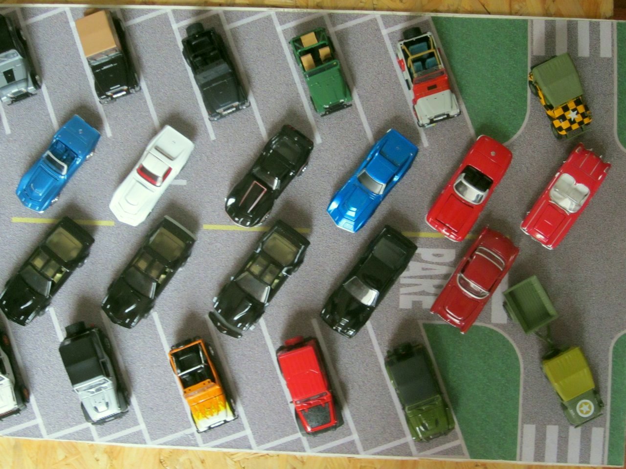 Nuevamente he sido invitado a participar por intermedio del CAEP como el año pasado, así que esta vez seleccioné inicialmente 56 autos de mi colección de marca y modelo Jeep, Pontiac Firebird y Chevrolet Corvette, para hacer algo distinto, colocándolos tentativamente en dos planchas de estacionamientos cubriendo un área de 1.05m x 0.60m de esta manera: