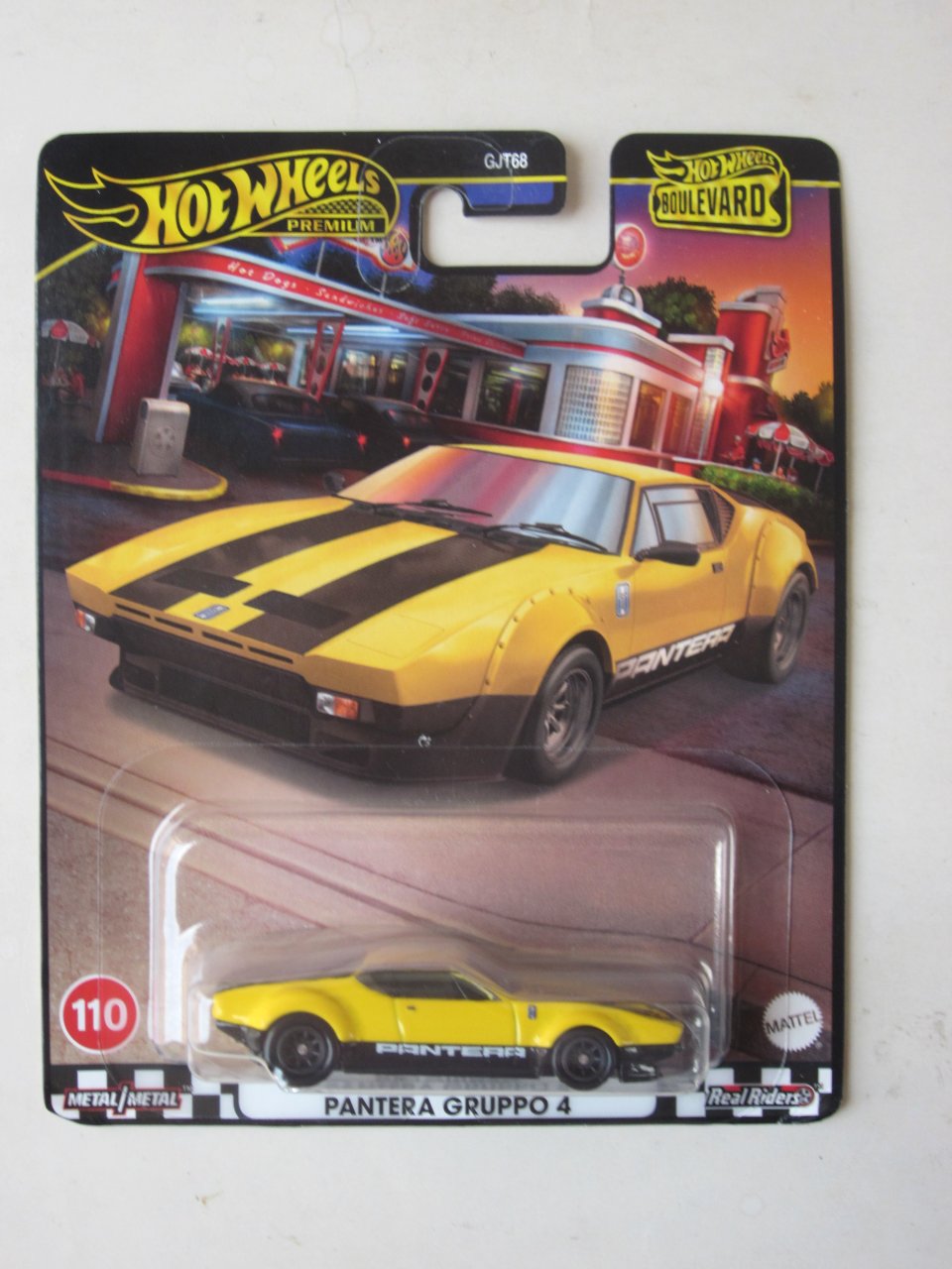 De Tomaso Pantera Gruppo 4 hecho por Hot Wheels, variante amarilla con franjas negras de la serie Boulevard del año 2024 (#110):